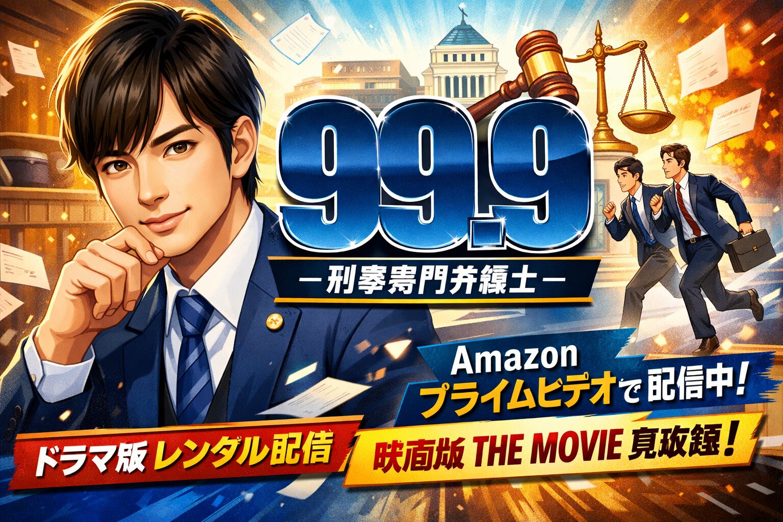 「99.9-刑事専門弁護士-」は、松本潤主演で日本の刑事裁判における有罪率99.9%に挑む弁護士たちを描いた痛快リーガルドラマです。Amazonプライムビデオでは、ドラマ版はレンタル配信(1話330円~)、映画版「99.9-刑事専門弁護士-THE MOVIE」は見放題配信中です。30日間の無料体験を活用すれば、映画版をお得に視聴できます。
