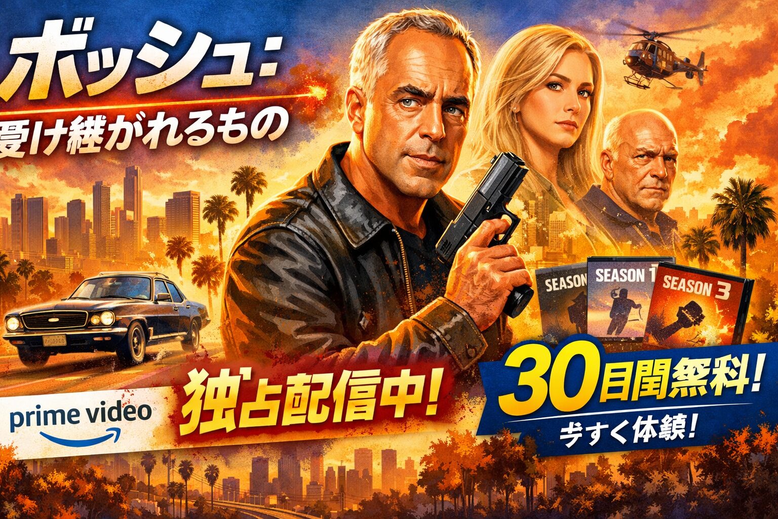 独占配信のため他のサービスでは見放題で観ることができず、Amazonプライムビデオに加入する大きな理由の一つとなる作品です。30日間の無料体験を利用すれば、実質0円で全話を視聴できますので、まだ未見の方はぜひこの機会にボッシュの世界に飛び込んでみてください。