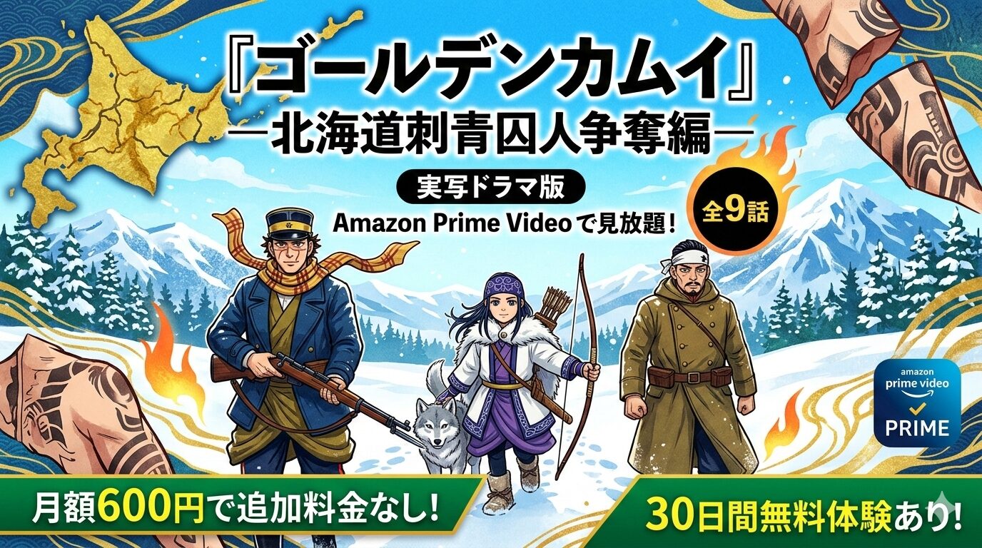 実写ドラマ「ゴールデンカムイ ―北海道刺青囚人争奪編―」は、2026年3月現在Amazonプライムビデオで全9話が見放題配信中です。月額600円(税込)のプライム会員なら追加料金なしで視聴でき、30日間の無料体験期間中に全話イッキ見することも可能です。映画版の続編となる本作を、今すぐチェックしましょう。