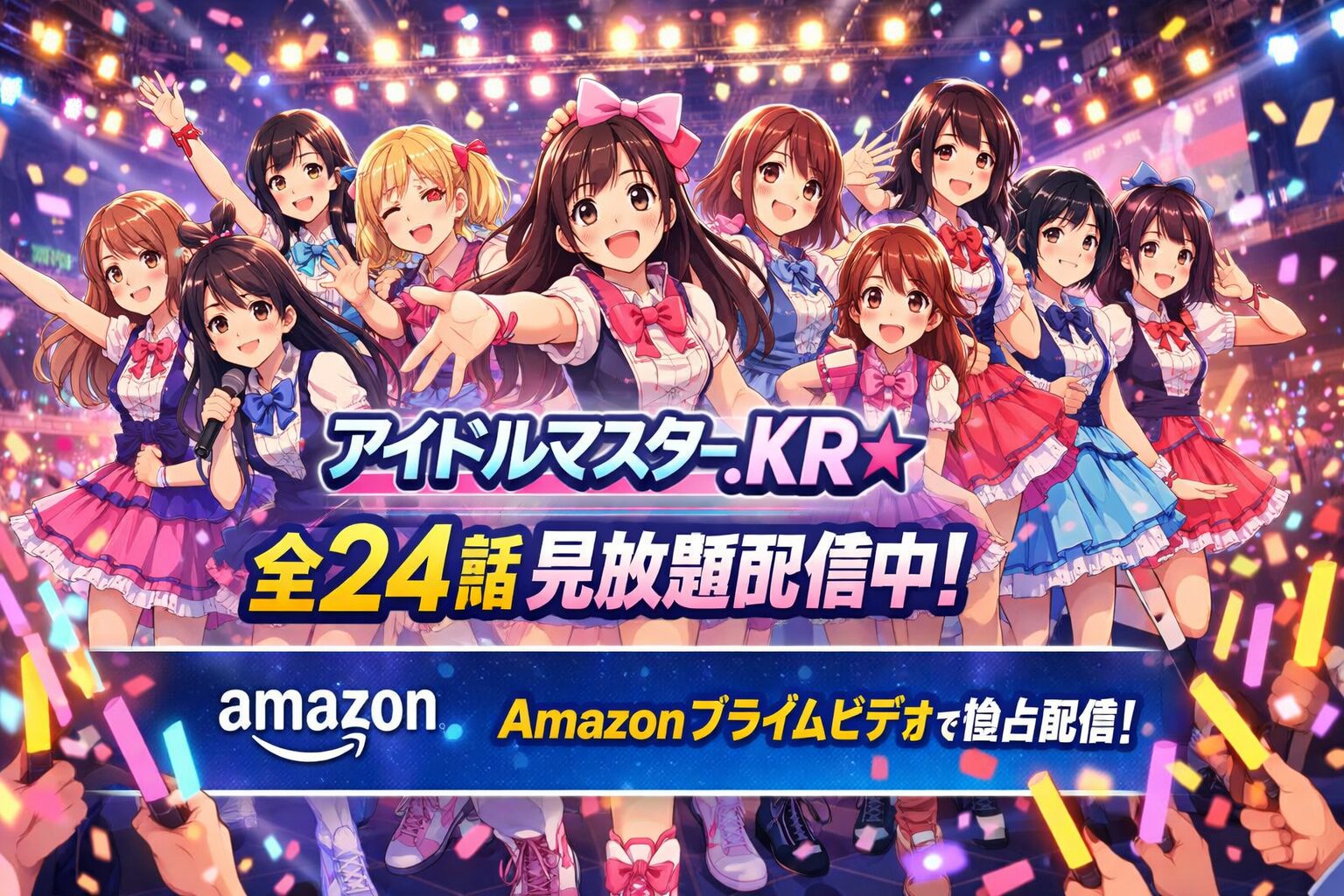 「アイドルマスター.KR」は、2026年2月現在Amazonプライムビデオで全24話が見放題配信中です。Amazonオリジナル作品として世界200以上の国と地域に独占配信されており、プライム会員なら追加料金なしですべてのエピソードを視聴できます。