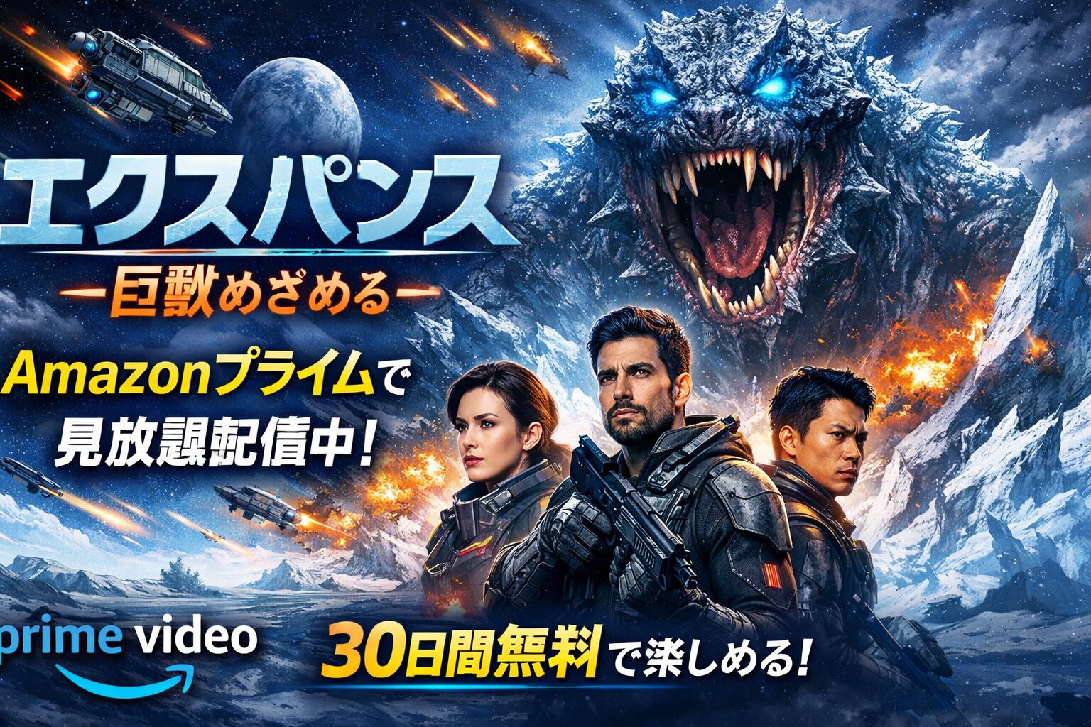 「エクスパンス -巨獣めざめる-」は、2026年2月現在、Amazonプライムビデオで見放題配信中です。シーズン1・4・6が見放題対象となっており、プライム会員なら追加料金なしで視聴できます。30日間の無料体験期間を利用すれば、まずは0円で本作の世界に飛び込めます。